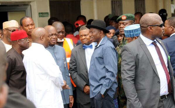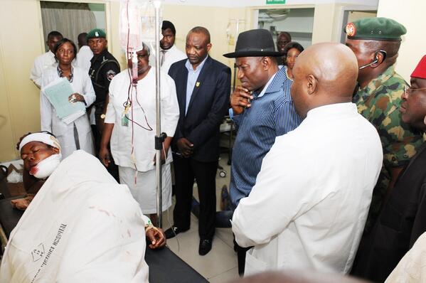 Nigeria’s President Jonathan was moments ago at the scene of the Nyanya, Abuja bomb blasts. Speaking through his spokesman, Dr. Reuben Abati, the president said he was “saddened by loss of lives in Nyanya bombing.” Dr. Abati communicating via Twitter also tweeted that, “President Jonathan has ordered heightened security in Abuja following Nyanya bombing. President Jonathan extends his heartfelt condolences to bereaved families. President Jonathan directs the medical services to do their very best to save the lives of those injured in Nyanya bombing.” The president was scheduled to be in Ibadan today for the centenary celebrations of the Olubadan of Ibadan. He has since visited Asokoro Hospital where some of the injured victims of the attack are currently undergoing treatment. There is a reported shortage of blood as blood donors are needed.